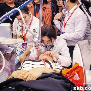记者看到,美博会的B区和C区有数十个展位设置了现场美容体验区,绝大部分都是涉及激光、纹眉、超声刀等医疗美容范畴的项目,有收费的也有免费的,做之前不需要进行任何身体检查。有的展商甚至摆出了十多张美容床,俨然把展位变成了一个临时美容院。虽然现场没有无菌手术室,还有一波又一波的路人“零距离”围观,美容师更是一边做项目一边介绍、推销,但这丝毫不影响围观群众的热情,不少人抢着排队体验。