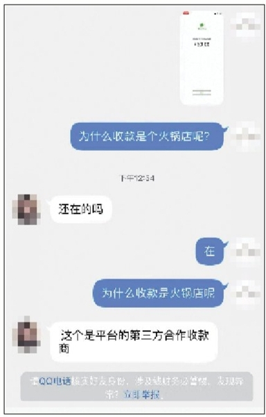 向“代充人员”付款时,对方发来的二维码显示为火锅店。