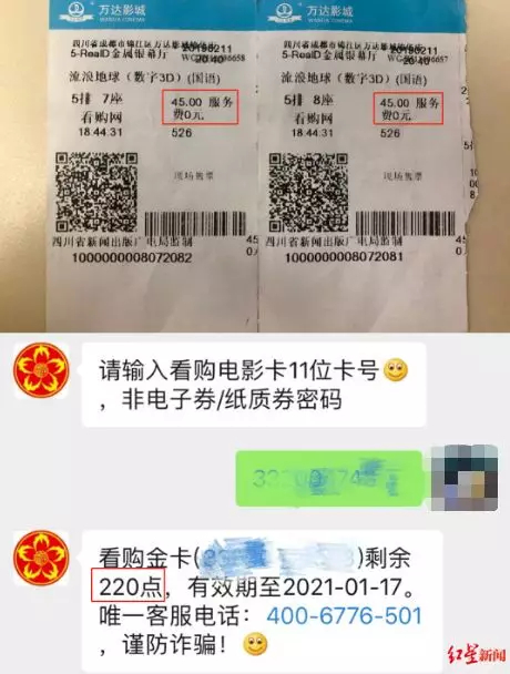 杨先生使用“看购电影”会员卡在万达影城锦华店观影,也是45元的票价,实际卡内扣除55点,而票面显示服务费0元,“那这10个点的差价去哪儿了?”