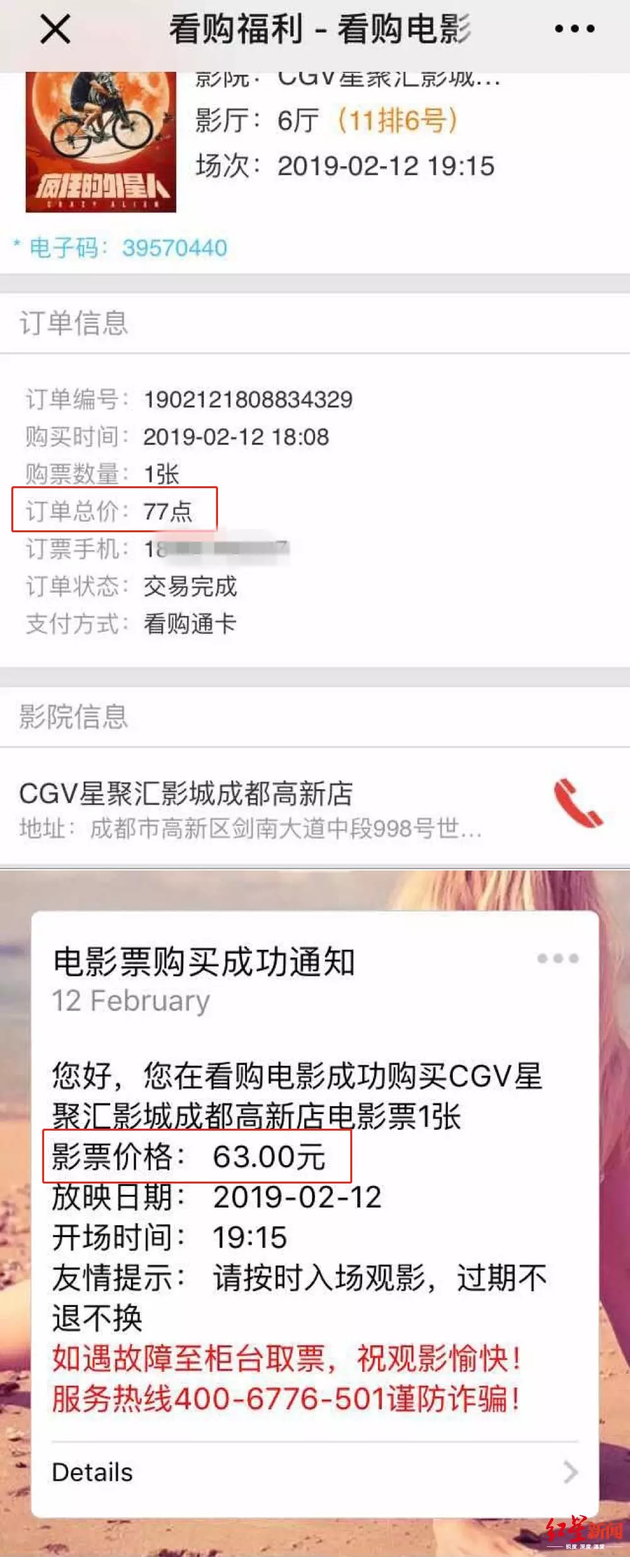 用户吐槽1:63元扣77点 40元扣46点近日,拥有一张“看购电影”会员卡的成都市民彭小姐想去影院看一场热门国产电影。当天18时许,她通过“看购电影”微信公众号“看购福利”购买了一张19:15开场的电影票,观影地点是CGV星聚汇影城成都高新店。