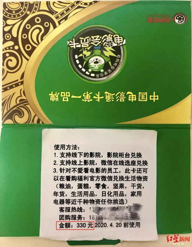 1元是否等于1点?两家客服均称“不等于”红星新闻记者了解到,“看购电影”会员卡由武汉映影正华文化传播有限公司发行。翻看袁女士提供的卡套,明确标注卡内金额为330元,她在使用前通过其官方微信号“看购福利”查询过,显示卡内330点。