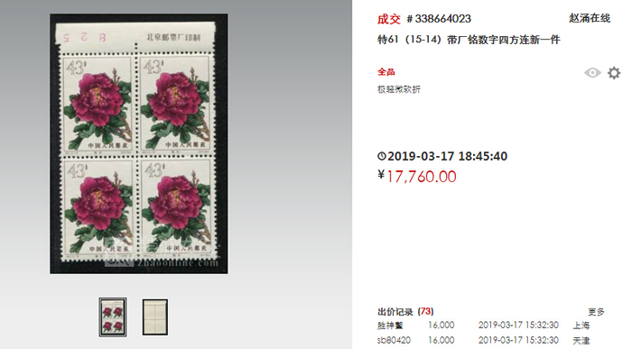 3月17日晚,一枚特61(15-14)带厂铭数字四方连新一件,出价记录73次,成交价为17760元。