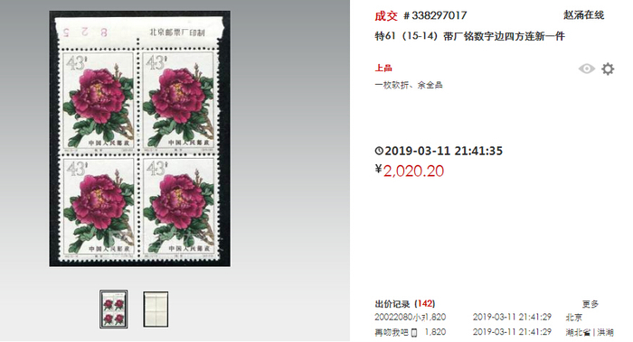 3月11日,一枚特61(15-14)带厂铭数字四方连新一件,出价记录142次,成交价为2020元。