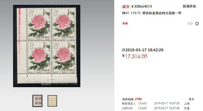 本次同时上拍一批全品牡丹邮票,形成聚合效应,平均出价次数近百次,有的甚至超过200次,你争我夺形成热抢之势,也间接推高了价格。
