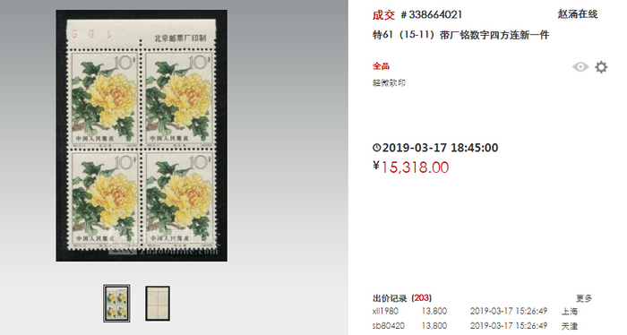 一枚特61(15-11)带厂铭数字四方连新一件,出价记录203次,成交价为15318元。
