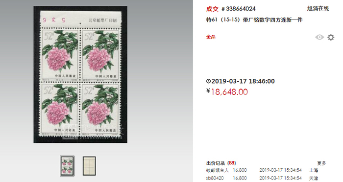 一枚特61(15-15)带厂铭数字四方连新一件,出价记录88次,成交价为18648元。