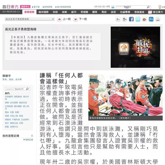 据港媒《昔日东方》报道,2011年2月的一天,途经石澳泳滩的吴宗权发现一位溺水的何姓老人,情况紧急之下,吴宗权立即下海与几位热心群众将老人救下,并谦称“任何人都会这样做”。吴宗权的此次义举,令外界对其大为赞赏。