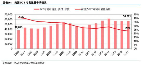 从研发投入看,美国研发占GDP比重常年稳定在2.5%以上。1996年,美国研发投入约2,067亿美元,占当年GDP比重2.55%;2015年,美国研发投入约5,014亿美元,占当年GDP比重2.79%。专利合作协议(Patent Cooperation Treaty)(以下简称PCT)是对于各个成员国提交专利申请进行审查从而满足各国对于专利保护诉求的协议,可以一定程度反映一国的创新能力。在2000年,美国PCT专利申请数量为38,013件,中国则为781件;2018年,美国PCT专利申请数量为56,671件。从专利技术的分布来看,美国的专利申请集中在电气工程、仪器、机械工程和化工等。