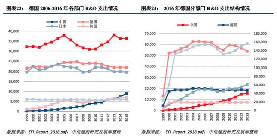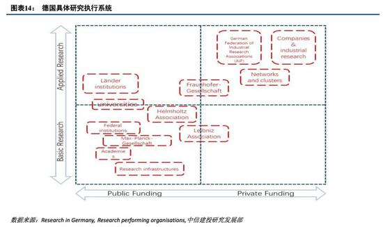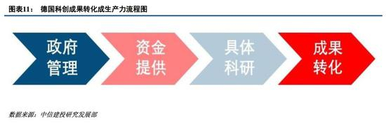 从科创体系来看,科创成果转化成生产力大致需要政府管理、资金提供、具体科研以及研究成果转化四个环节。德国政府的管理和资助,是形成科技创新的原动力。政府管理主要包括科技立法、规划投资、协调咨询三个方面。资金的提供主要来自经济界、政府与私人非营利机构和国外三大部门。具体的科研由高等院校、大学外研究机构和政府研发机构承担。由于良好专利保护,科研成果很好的转化为了生产力。