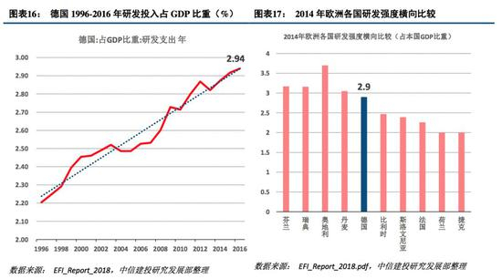 研发支出是研发投入的第二个重要维度。21世纪以来,德国的研发支出在不断增加,特别是金融危机以后,德国研发投入更上一个台阶。2016 年,德国研发投入占 GDP 比重达到了2.94%,基本完成了《德国高科技战略2020》制定的研发经费占GDP的3%的目标。在与欧盟国家的横向比较中,德国的研发强度排在第五位,在传统强国中排名第一。