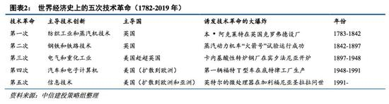 自工业革命以来,世界经济共出现的五次技术革命。第一次技术革命的标志性事件是1771年阿克莱特在英国克罗弗德开设工厂,第二次技术革命标志性事件则是蒸汽动力机车“火箭号”在利物浦到曼彻斯特铁路上试验成功。两次技术革命都发端于英国,随后扩散到欧洲大陆与美国。在第二次技术革命后期,世界经济结构发生根本性变化,美国工业生产总额占比达29%,英国占27%,美国超越英国成为资本主义新的经济中心。随后三次技术革命分别是电力时代、汽车时代与信息时代,主导国从英国转移到美国。