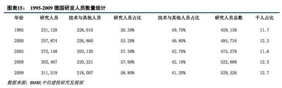 研发人员数量是衡量国家对于科学研究重视程度的重要指标。一般来说,研发人员分为两类,分别是研究人员和技术与其他人员,而前者往往具有更高的研究水平,是决定一国研究实力的关键。1995年至2009年,德国的研发人数和研发人员占总就业人口的比重都在稳步上升。