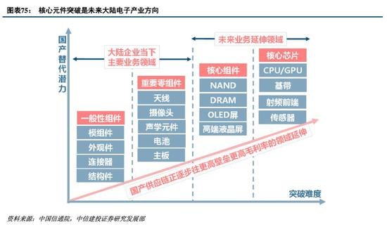 ① 国产化率较低,亟待追赶国外先进水平的核心元器件领域,包括半导体的设计/制造/先进封测,及上游的设备与材料环节;
