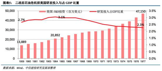美国主导了第三轮到第五轮的科技革命。二战之后,美国政府机构通过资金、政策等多种方式,对研究体系提供支持,构建了社会研究体系。由于石油危机和日本德国的崛起,民间投资进一步驱动力了科技创新,促进了经济的发展。在计算机、半导体技术和通信技术、军工、医药等每个领域都领先全球,实现了科创立国。