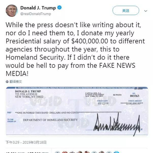 特朗普还不忘记向黑自己的“假新闻媒体”喊话:我每年都将40万总统工资捐献给不同机构,看看你们自己做了什么?