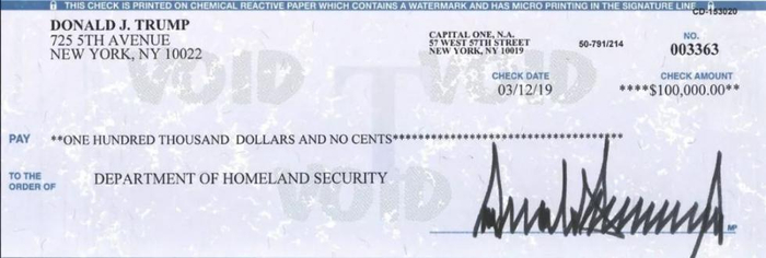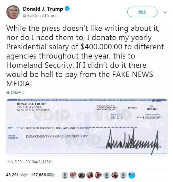 当地时间周一下午,美国总统特朗普在推特上霸气地甩出一张支票,显示自己将10万美元捐给了国土安全部。