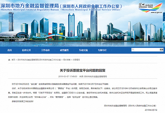 此外,深圳市地方金融监督管理局一则《关于投诉票据宝平台问题的回复》同样提及,目前票据宝平台已被立案侦查。根据“行政不干预司法”的原则,金融部门无权介入公安办案,请投资人尽快向公安机关报案,公安机关正在积极开展追赃挽损工作。