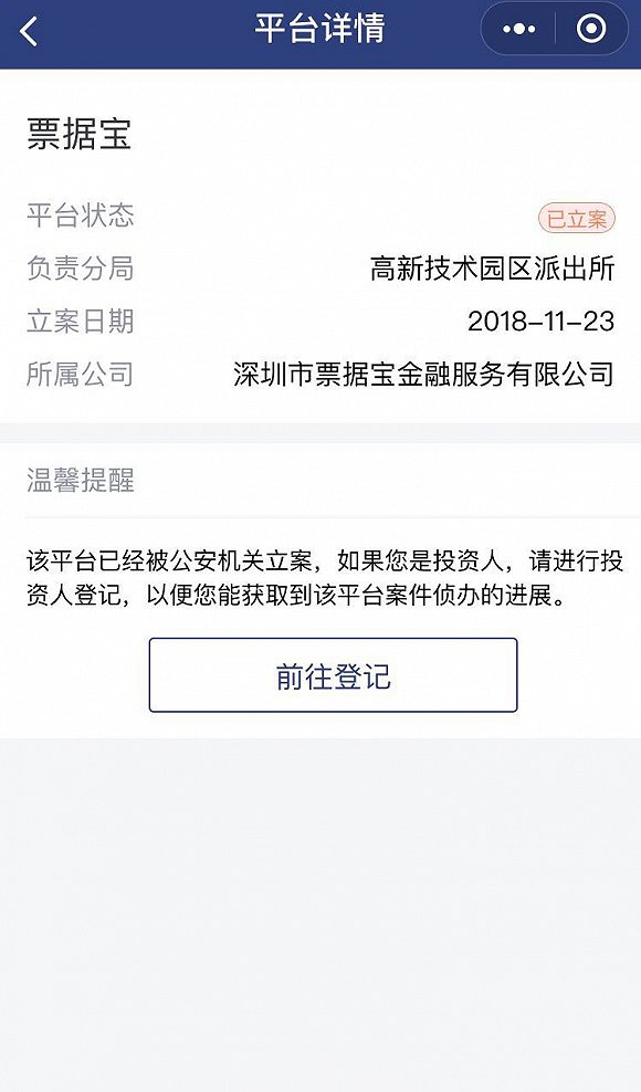 深圳互金平台投资人报案登记系统显示,票据宝平台2018年11月23日已被立案,负责分局为高新技术园区派出所。