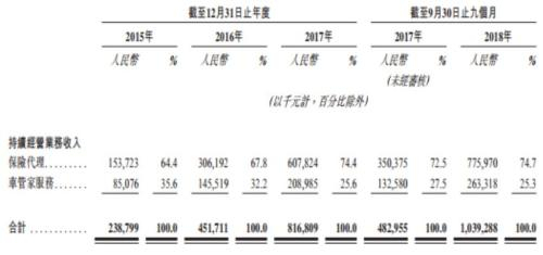 数据显示,2015年、2016年、2017年各年度及2018年1-9月,盛世大联分别售出逾26万份、48万份、73万份及120万份保单,保费总额分别约为8亿元、13亿元、22亿元及27亿元,保险代理业务收入分别为1.54亿元、3.06亿元、6.08亿元及7.76亿元,分别占持续经营业务所得总收入的64.4%、67.8%、74.4%及74.7%。同期总体平均佣金费率分别为18.4%、23.4%、27.7%及28.5%。