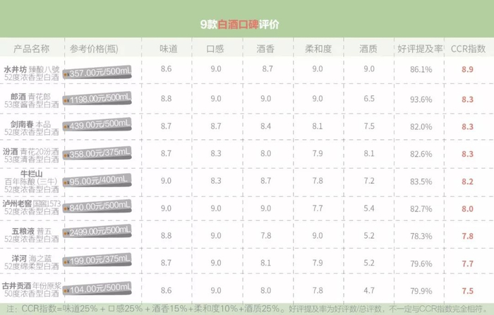 本刊分析了三大电商平台共12631条使用评价,对9款知名白酒进行了口碑评价,包括泸州老窖、五粮液、汾酒、剑南春、洋河、郎酒、水井坊、古井贡酒、牛栏山,从味道、口感、酒香、柔和度、酒质等5个维度综合评价。
