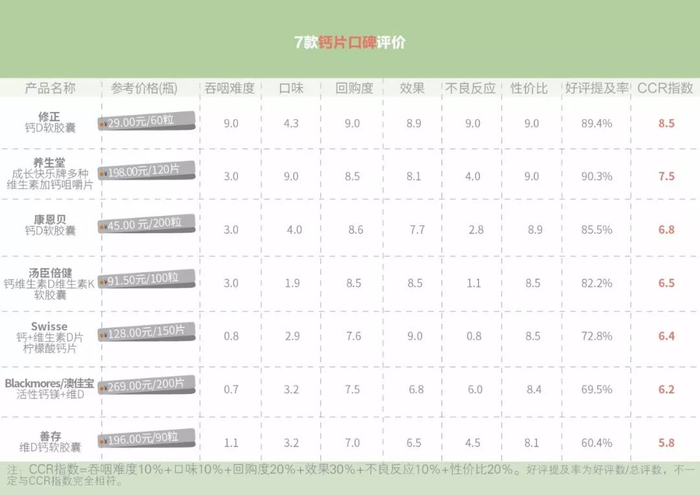 本刊分析了三大电商平台共14850条使用评价,对市面上主流的7款钙片进行了口碑评价,包括汤臣倍健、Swisse、修正、养生堂、康恩贝、善存、Blackmore/澳佳宝,从吞咽难度、口味、回购度、效果、不良反应、性价比等6个方面综合评价。