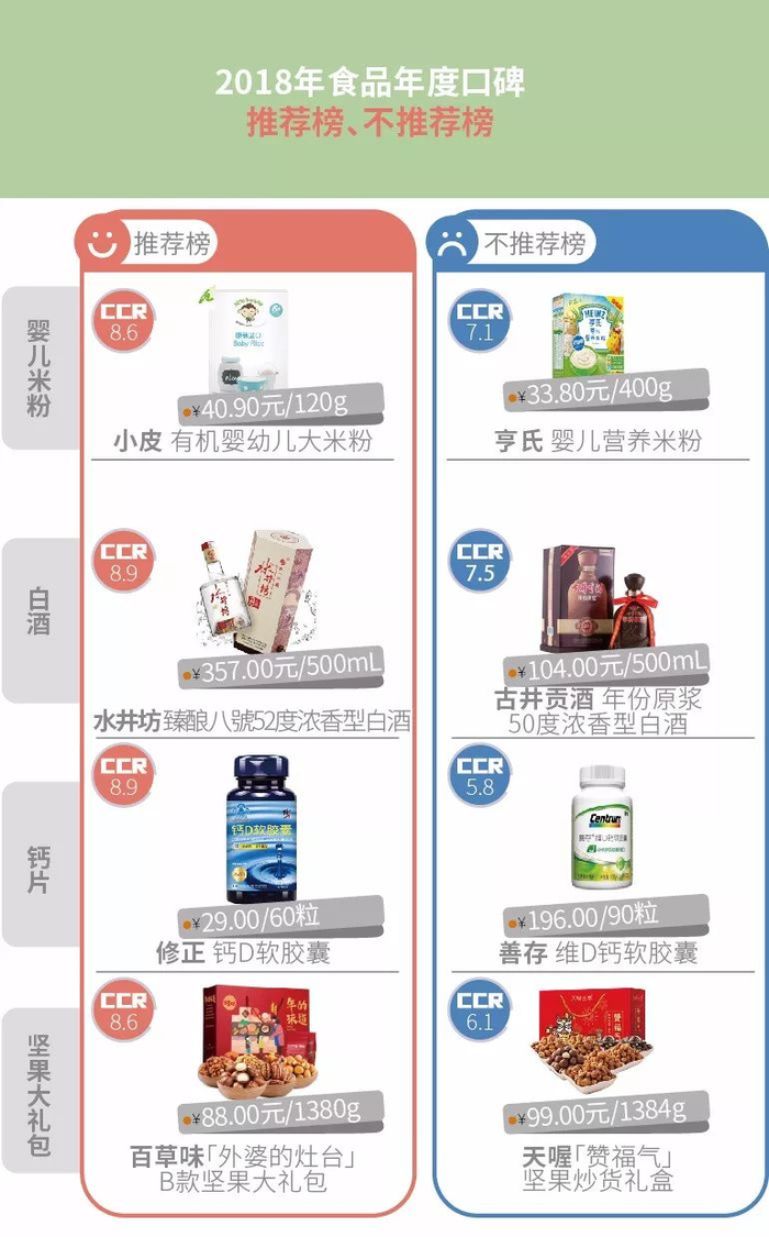 2019年1月,《消费者报道》整理了天猫、京东、苏宁旗舰店上约6.6万条消费者使用评价,针对婴幼儿米粉、白酒、钙片、坚果大礼包等4类食品共33款食品进行了口碑评价,推出了年度推荐产品和不推荐产品。