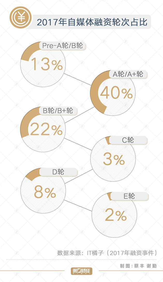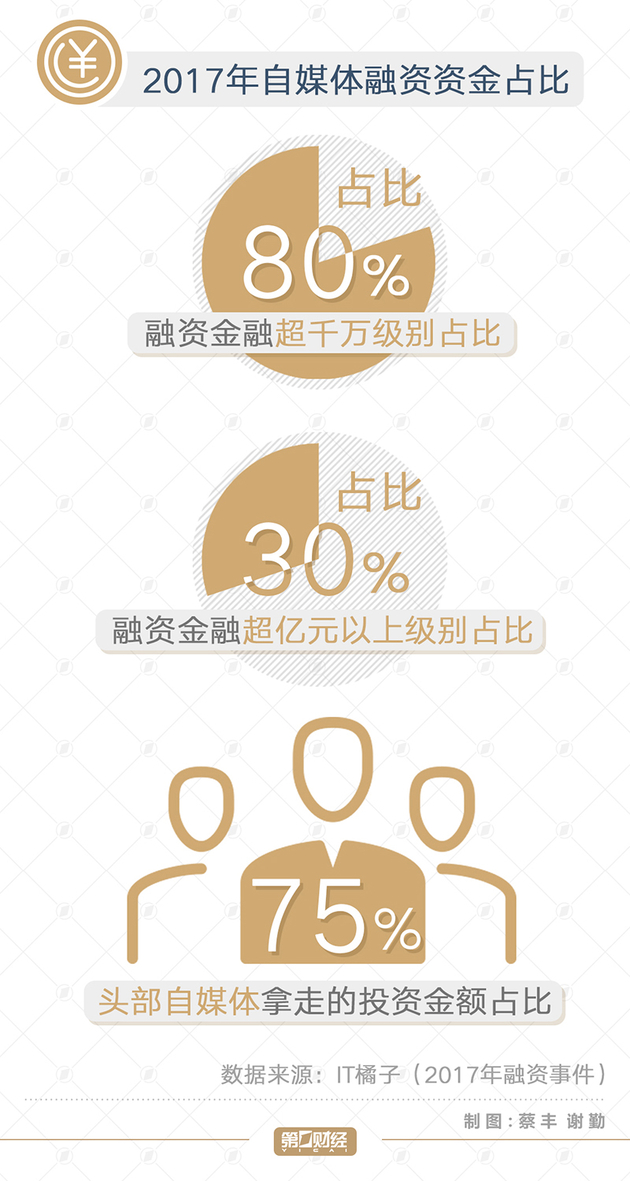 2017年,自媒体的头部效应愈加明显。从投融资轮次来看,亿级融资表现亮眼。B轮及B轮后占到了33%,且融资连续性强,75%的投资金额被头部自媒体拿走,“马太效应”更加突出。