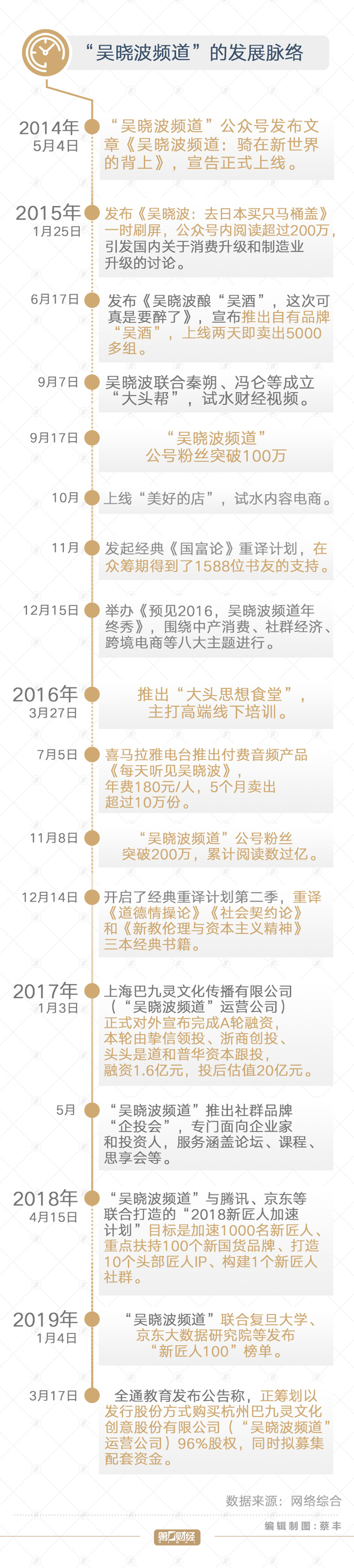 5年间,“吴晓波频道”成功实现了自媒体升级,将“吴晓波”做成了真正的IP。两年前,“吴晓波频道”A轮投后估值就达到20亿元,虽然全通教育在相关公告中并未提及此次收购的具体金额信息,但估值应比两年前更高。
