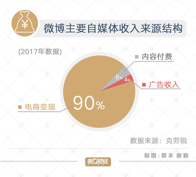 几年前,自媒体还集中于广告投放的变现模式,而根据克劳锐2018年3月发布的《2018自媒体行业白皮书》数据,在其调研的TOP500自媒体中,截至2017年年底,变现模式占比中,自媒体广告投放的占比虽为最高,但增长率仅为18.75%。电商占比大幅增长50%,IP变现占比增长达到了200%。此外,从2017年微博主要自媒体的收入来看,电商变现已经成为了最主要的收入来源,占比高达90%。