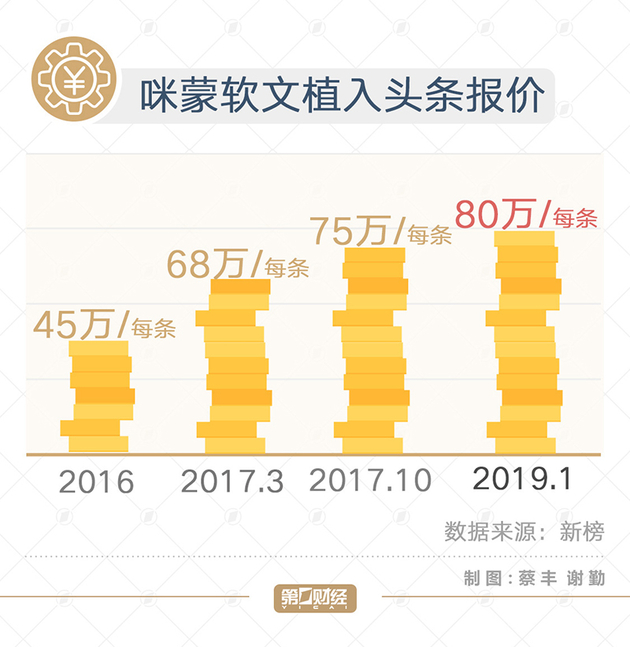 较为典型的案例是咪蒙,创始人马凌的入局不算早。2015年底刚创业失败的的她以“咪蒙”为笔名在公众号上发布了《致贱人:我凭什么要帮你?》,酣畅淋漓的情绪发泄文体迅速火爆公众号。2016年,坐拥1600万粉丝、95%的文章达到10w+阅读量的咪蒙已跻身头部,除了资本,其自身在流量变现时代,也备受品牌主的青睐,公众号头条软文植入价格逐年上升,在业内屡创新高,逐年上升。数据显示,2016年咪蒙的头条报价是45万/条,而到2019年1月,更是提高至80万/条,几乎翻了一番,吸金能力可见一斑。即以咪蒙每年超过100篇的广告发布量来看,仅咪蒙单个公众号的收入,每年就可能接近1亿。