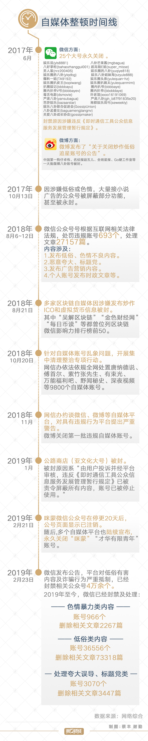 网信办根据《中华人民共和国网络安全法》制定新版《互联网新闻信息服务管理规定》,2017年6月1日开始施行,同月8日,一大批总价值上百亿公众号被永久封号;咪蒙也在期间被禁言一个月。但“逃过一劫”的自媒体号和资本继续不断试水,寻找边界。2018年10月,网信办再次开展大规模集中清理整治专项行动,一月之内处置近9800多个自媒体账号,自此强监管时代开启。
