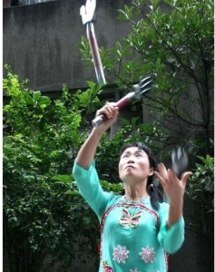 刘陶惯常表演用花棍,一根棍子上缠着彩带和铜钱。随着刘陶双手不断地舞动,三根花棍像翩翩的蝴蝶飞舞起来了,她开始唱孟姜女哭长城的故事,同时还要根据故事的发展踏舞步,摆出不同的姿势;耍起刀时,刀影舞动,不由得让人将心提到嗓子眼。刘陶介绍,“飞刀花鼓”是凤阳花鼓传进四川后的变种,是功夫和艺术的结合体,必须两个人配合,在法国演出时,是刘陶抛三把刀(叉、棍)主唱,爷爷打锣鼓伴唱。