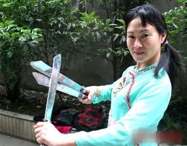 少者为女孩,小巧玲珑,眉清目秀,身穿彩衣,灵巧干练;老者年逾花甲,瘦高个儿,腰板硬朗,面庞清癯。只见,两把亮晃晃的飞刀在女孩手中上下翻飞,在空中成两条银色的弧线,女孩准确无误地接过飞刀,又接连不断地抛向空中,周而复始,飞刀的弧线呈现一片刀光剑影,令人胆战心惊!老者却在一旁镇定击鼓,一边唱着四川小调。