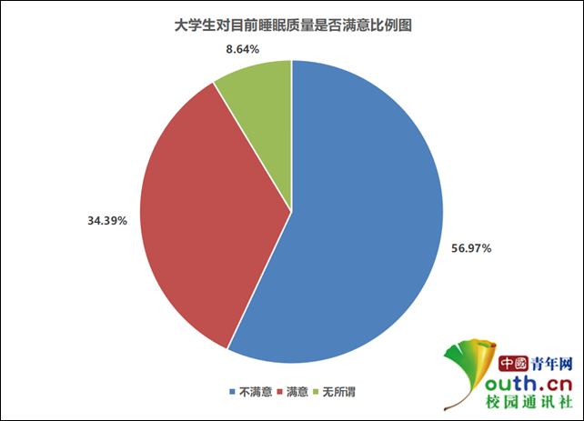 大学生们对自己的睡眠质量是否满意呢?中国青年网调查显示,56.97%的大学生认为不满意,其次为满意,占34.39%,还有8.64%认为无所谓。