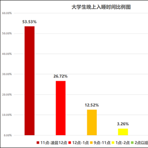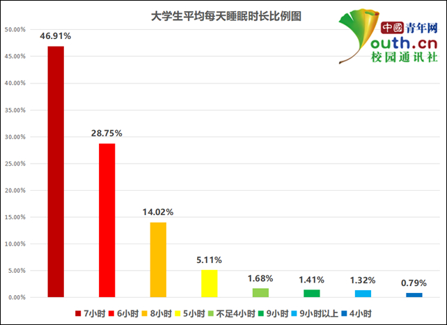 目前,大学生作息情况如何?调查显示:有32.8%的大学生0点之后睡觉,其中,0点到1点占26.72%,1点到2点占3.26%,2点以后占2.82%。另外,有53.53%的大学生在晚上11点到12点睡觉。在睡眠时长方面,有36.33%的大学生平均睡眠不足7小时,46.91%的睡眠时间为7小时。