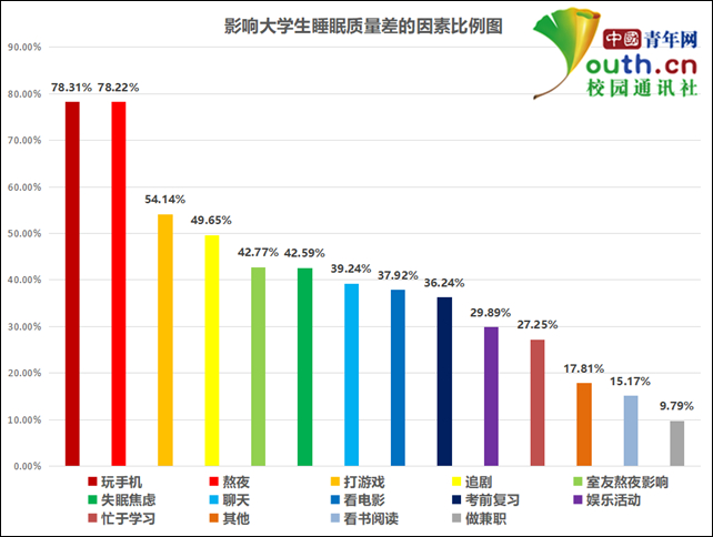 在调查中,熬夜、玩手机、打游戏成为大学生睡眠质量差的主要原因,分别有78.22%、78.31%和54.14%大学生选择。另外,聊天、追剧和看电影,分别是39.24%、49.65%、37.92%。