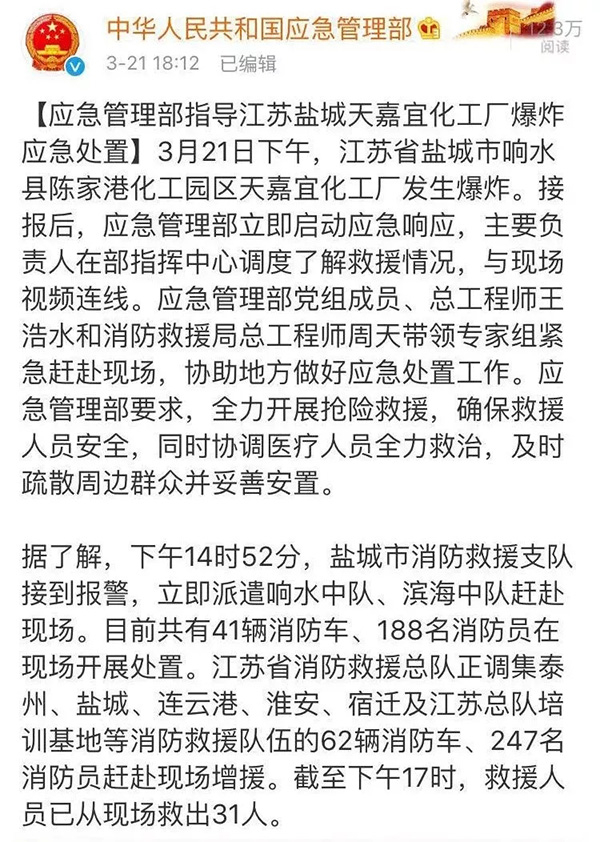 下午,江苏省盐城市响水县陈家港化工园区天嘉宜化工厂发生爆炸。接报后,应急管理部立即启动应急响应。截至下午17时,到场消防救援力量已救出31名受伤人员。