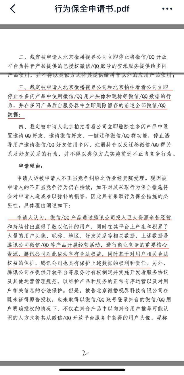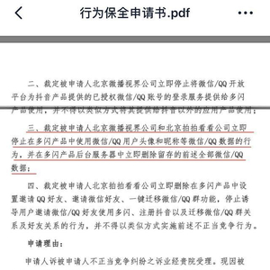 1.今年2月,深圳市腾讯计算机系统有限公司在天津滨海法院起诉抖音和多闪的运营公司,同时申请行为禁令。