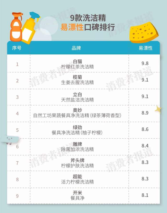 此外,绿劲、奥妙、立白、斧头牌、榄菊、开米、白猫等7款洗洁精去油去污力都非常不错,足以应付日常的碗碟清洗需求。