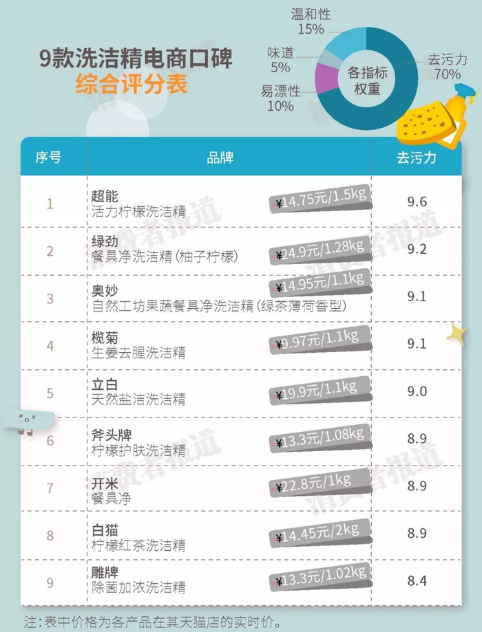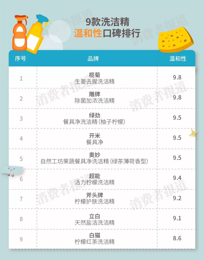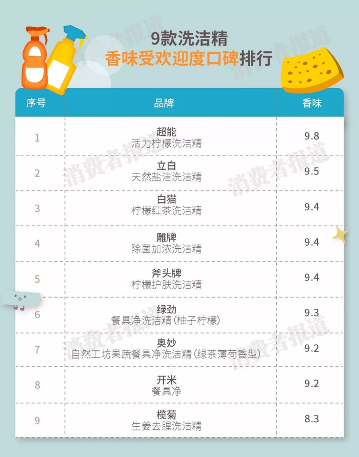 口碑结果显示,超能活力柠檬洗洁精综合评分最高,主要胜在去污力强、温和不伤手,味道清新自然;榄菊、奥妙、立白三款既有一定的清洁力,也易漂易冲,不费水;相对而言,雕牌除菌加浓洗洁精口碑评分垫底,主要是因为不够去油,清洁能力稍逊。
