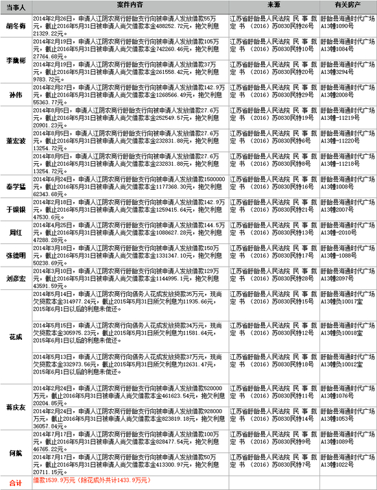 财联社记者从中国裁判文书网信息梳理发现,14当中的12人有从江阴农商行盱眙支行贷款记录,贷款合计1539.9万元。除花成的三套房产是在截止2015年5月31日无还款记录外,其他11人均在截止2016年5月31日无还款记录,且裁定均为特别诉讼。