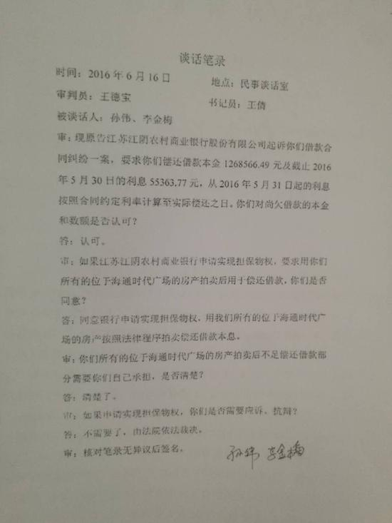 孙伟提供的“谈话笔录”显示,孙伟签字时间是2016年6月16日,地点民事谈话室,审判员王德宝,书记员王倩。内容包括:认可房贷尚欠借款的本金和数额;同意银行申请实现担保物权,拍卖贷款房产用于偿还借款本息;拍卖不足偿还借款部门需要孙伟本人承担;不需要应诉、抗辩。