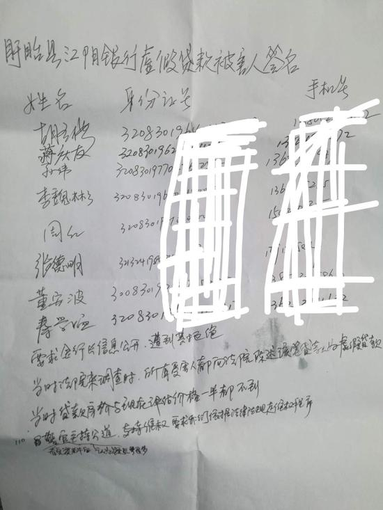 附有8位当事人(部分人提前离开没有签名)身份证号和手机号的签名信中写道,“要求金行长信息公开,遭到其拒绝;当时法院来调查时,所有受害人都向法院陈述该笔贷款为虚假贷款;当时贷款房价与现在评估价格一半都不到;警官主持公道,要求我们依据法律法规走维权程序。”