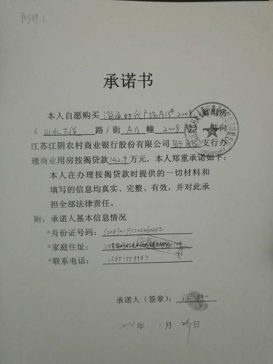 江阴农商行回复记者的采访也显示,“2014年1月26日,孙伟购买位于盱眙县盱城镇某商用房,总价285.81万元。2014年2月27日,根据本行相关规定,向孙伟发放按揭贷款142.9万元,按合同约定直接转入盱眙海通置业有限公司监管账户。”