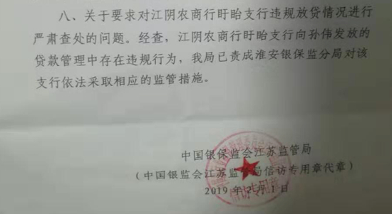 不过,据银保监会江苏监管局给孙伟的答复信显示,经查,江阴农商行盱眙支行向孙伟发放的贷款管理中存在违规行为,已责成淮安银保监分局对该支行依法采取相应的监管措施。对此要点,江阴农商行在接受财联社记者采访时也给予了否认,称在孙伟的贷款“整个业务办理过程中本行没有违规行为。”
