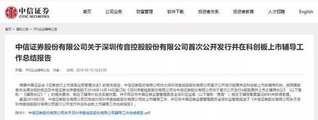 3月15日消息,中信证券官网公告称,截至2019年3月,公司已完成对深圳传音控股股份有限公司的上市辅导工作,传音控股拟在科创板上市。