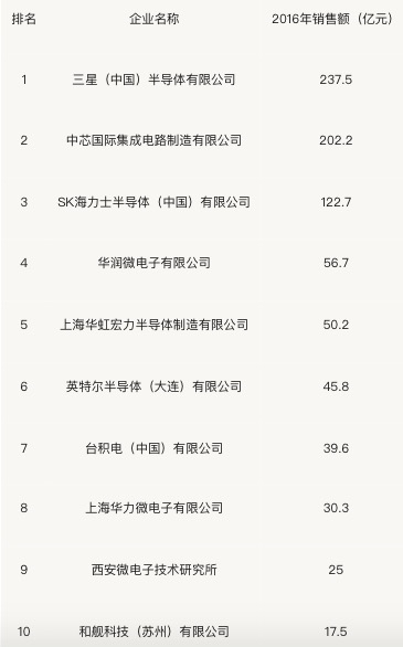 图为2017中国半导体制造企业排名