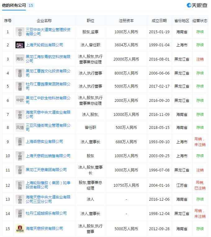 第三方网站还显示,目前,曹波担任董事长的企业有3家公司,分别为牡丹江超越娱乐有限公司、黑龙江天懋集团有限公司、上海森懋实业有限公司。另外,曹波为8家公司的控股股东,2家为全资控股,分别为黑龙江海东青航空科技有限公司、上海轮胎橡胶(集团)如皋投资有限公司(已被注销)。