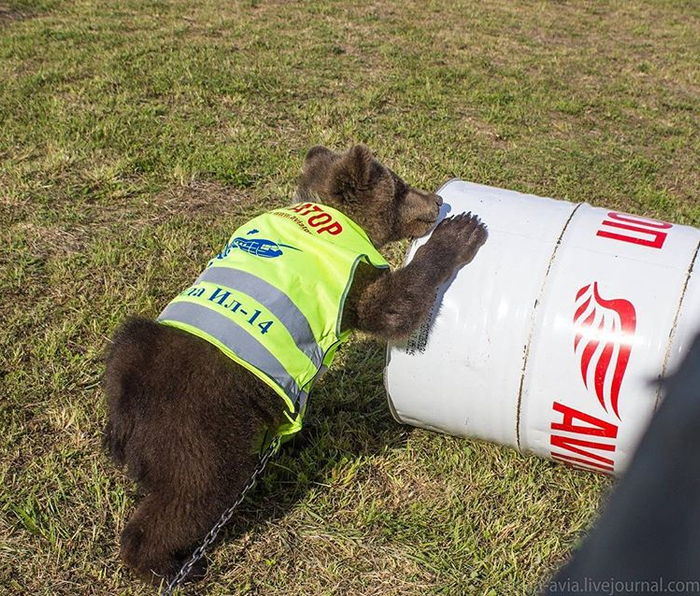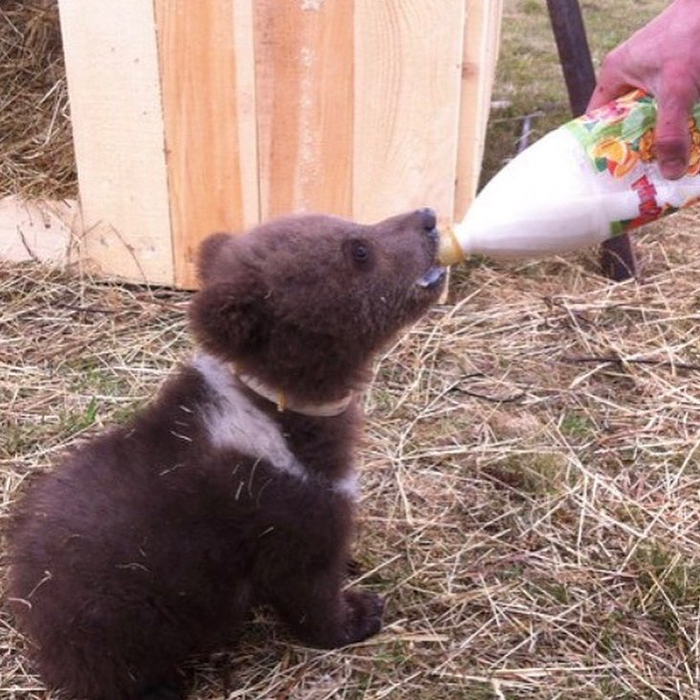 收工下班的飞行员伊万看见它独自一熊,好像饿了很久,就将它带回基地,试探性地喂了一瓶奶。