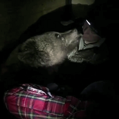 回到基地当晚,阿熊不断地舔舐着飞行员们,表达着自己的想念。